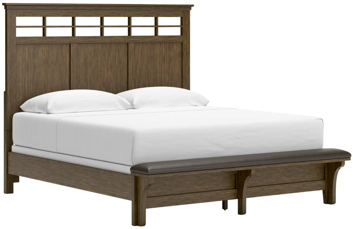 Includes panel headboard, rails, upholstered bench footboard and slats